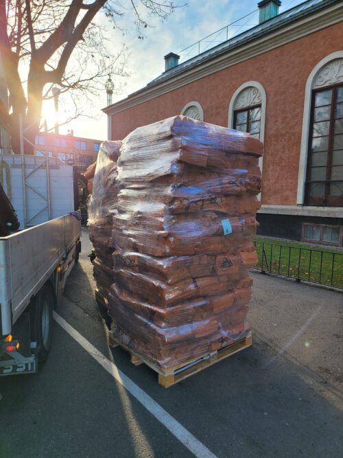Torkad björkved i 40L-säckar, totalt 77 st travade på pall. Veden är väl packad så volymen motsvarar cirka 6 kubikmeter stjälpt ved. Detta är mest ved för pengarna. Säckarna är lätta att hantera och veden levereras väl packad. Veden har den absolut högsta kvalitet, så den är lätt att tända, brinner bra med högt värmevärde. Veden är torr och skyddad under hela leveranskedjan från torkningsprocess till leverans hem till dig. Pallens yttermått är 120 cm x 100 cm x 210 cm, och veden är 23-26 cm lång med en diameter på 6-15 cm.
